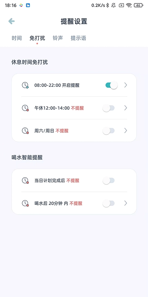 3、点击免打扰,还能关闭自定义时段的喝水提醒,细致覆盖休息时间的每分每秒,不必担心它会影响计划的顺利完成。