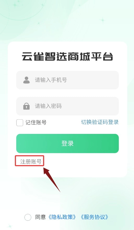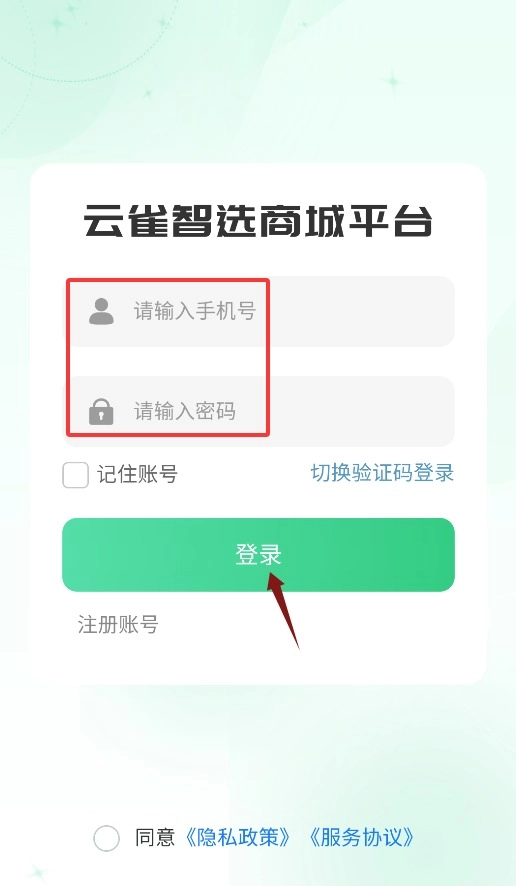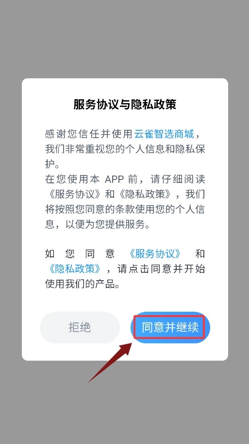 首次打开应用时,需点击确认弹窗中的协议,同意后才能进入登录界面。