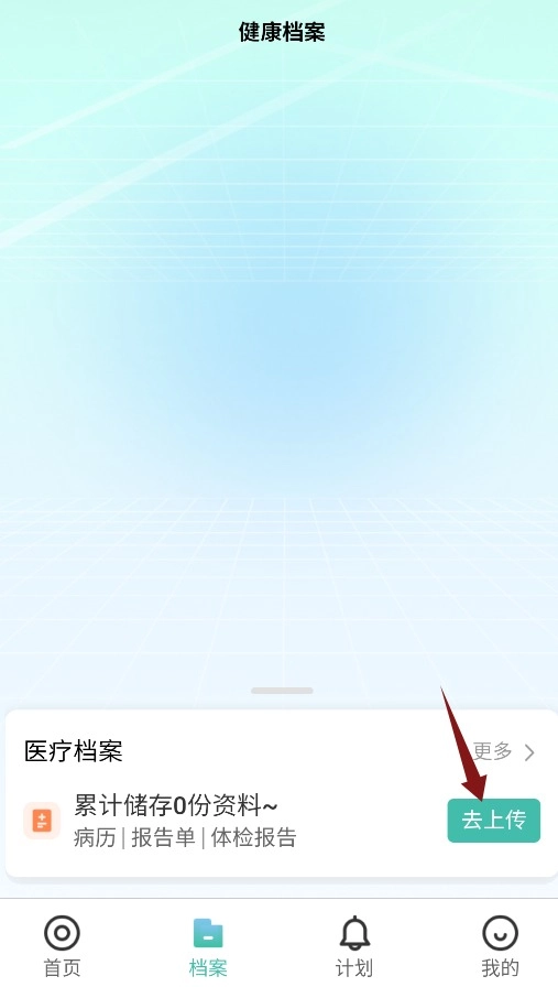 3、在档案界面点击“去上传”按钮,就能提交个人医疗档案。