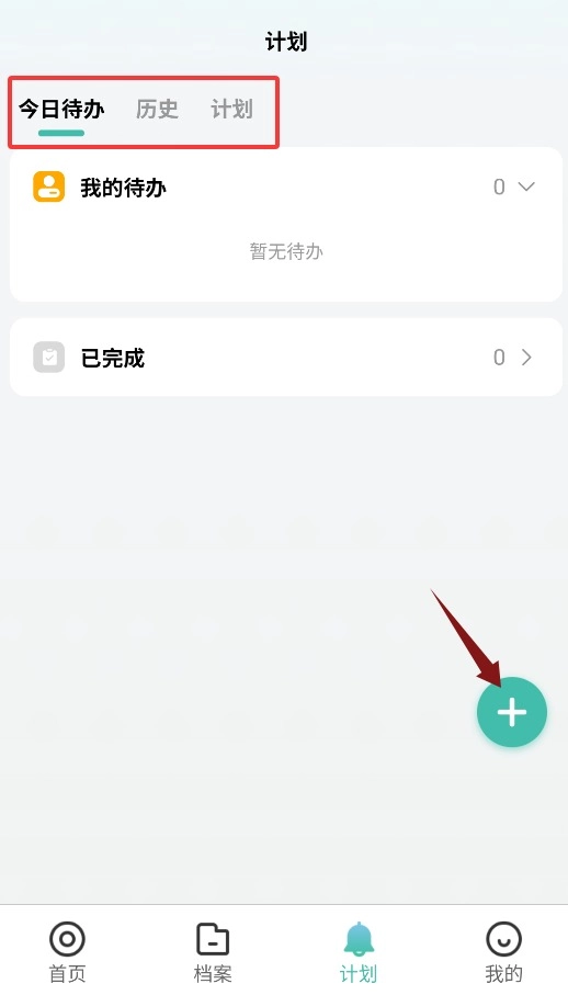 计划界面包含三个板块,分别是今日待办、历史记录和未来计划。