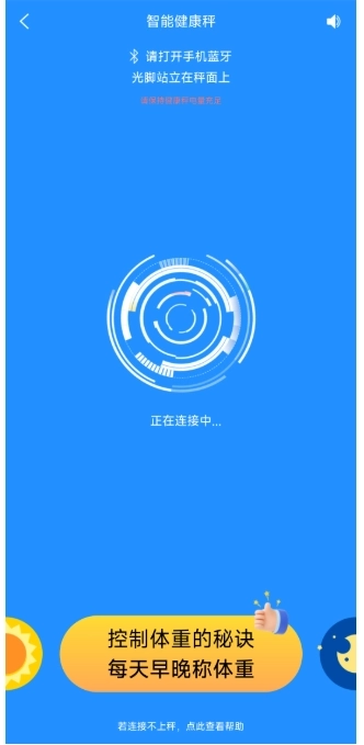 6、请开启手机蓝牙功能,光脚站在秤面上,待连接成功后,系统将自动开始智能分析