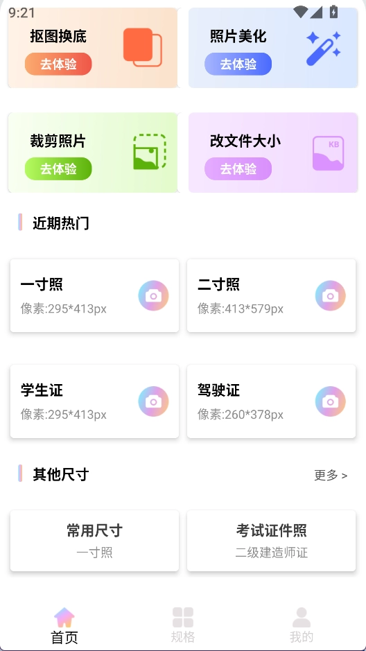 1、丰富的证件照尺寸选择:涵盖护照、签证、考试报名、工作简历等各类用途的证件照规格,能够满足不同场合在照片尺寸与背景颜色方面的需求。