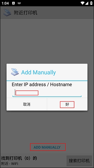 5、进入【搜寻附近打印机】页面,点击【Add Manually】选项,输入打印机地址并进行确认,待连接成功后就能直接发起打印操作。