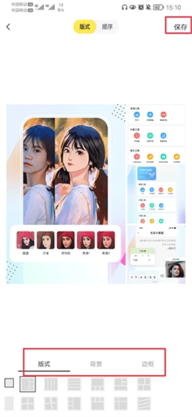 3、在拼图编辑界面中,选择合适的版式、背景与边框,完成设置后点击保存;保存的照片可在手机相册中查看。