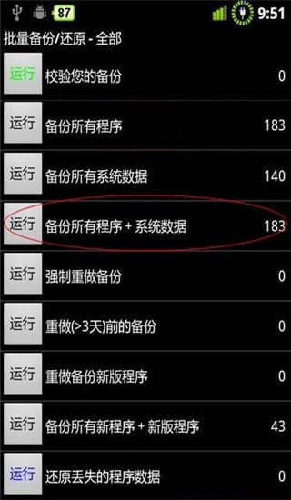 3、完成上一步操作后,就会进入图六所示的界面。钛备份会自动识别出备份程序,此时上推菜单找到红圈标注的“还原所有的程序和数据”选项,点击其左侧的“运行”按钮即可。