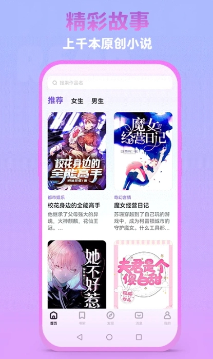 1.它提供男性和女性两种选择,允许用户根据自己的性别方便地找到自己喜欢的小说资源。