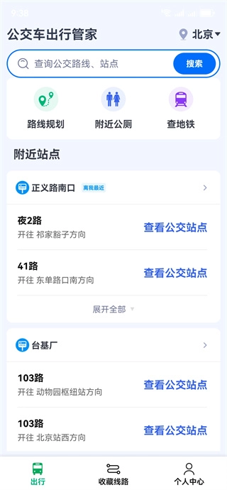 2、软件核心功能包括路线规划、附近公交/地铁站点查询以及查找周边公厕等。