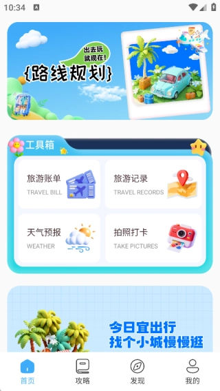 首页集成了旅游账单、旅游记录、天气预报和拍照打卡等功能。