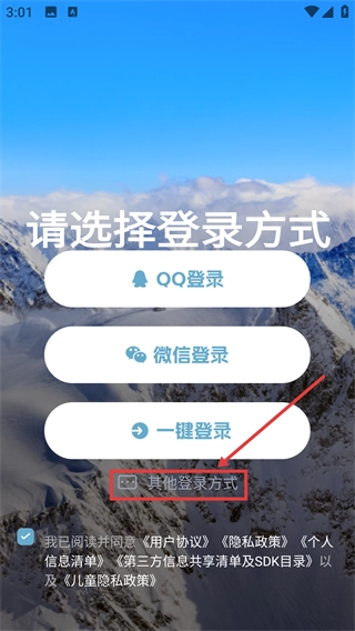 在登录方式选择页面点击【其他登录方式】,即可进入手机号登录的信息填写界面。