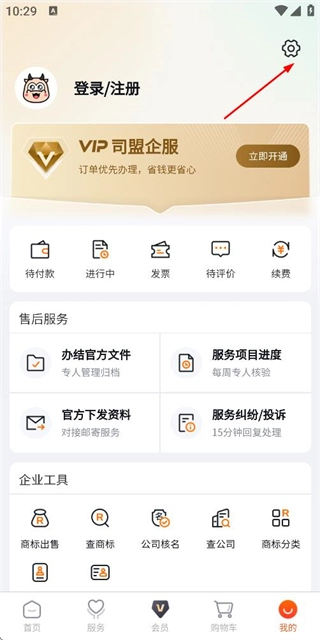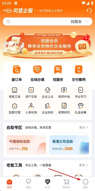 1、在司盟企服首页,点击底部导航栏中的“我的”选项,即可进入个人中心页面。