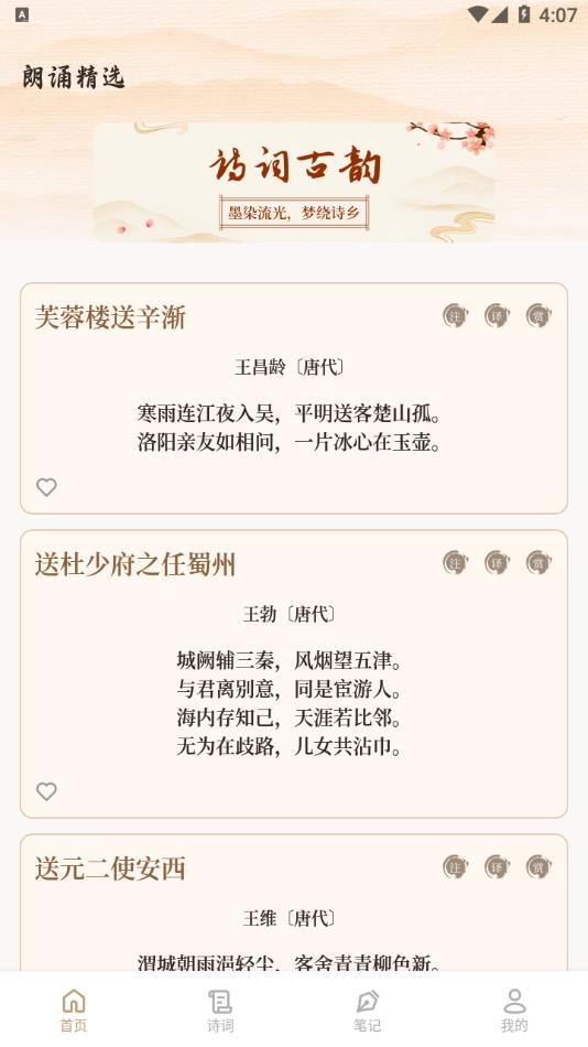 从诵读感知入手,历经赏析理解的过程,再到笔记整理的收尾,功能覆盖了诗词学习的全部环节,构建起闭环式的学习体验。