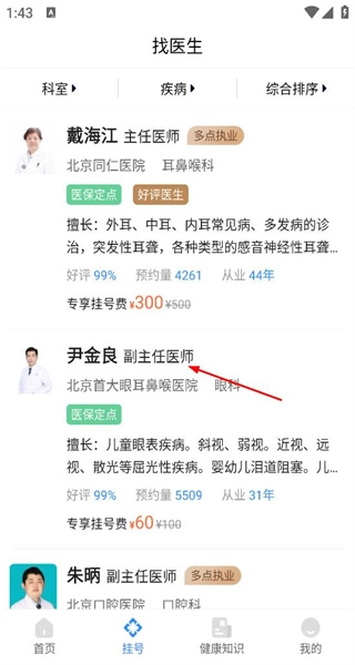 登录系统后返回首页,点击“找医生”选项,进入医生列表页面,挑选合适的医生,启动挂号流程。
