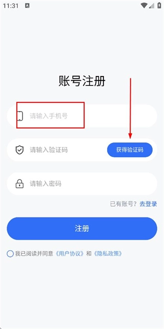2、在账号注册页面输入手机号码后,点击获取验证码按钮。