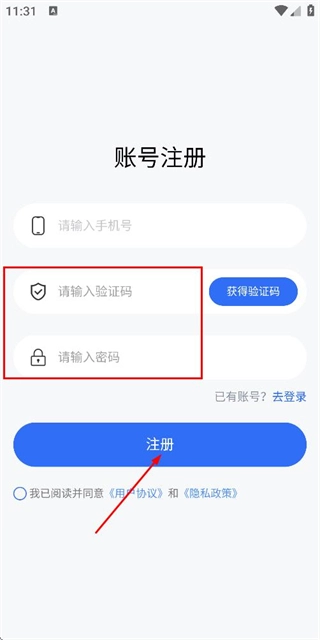 3、进入注册账号页面,填写验证码与密码,勾选相关协议后,点击注册按钮以完成注册流程。