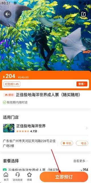 3、在商品详情页面点击立即预订按钮,即可进入该门票的预订流程。