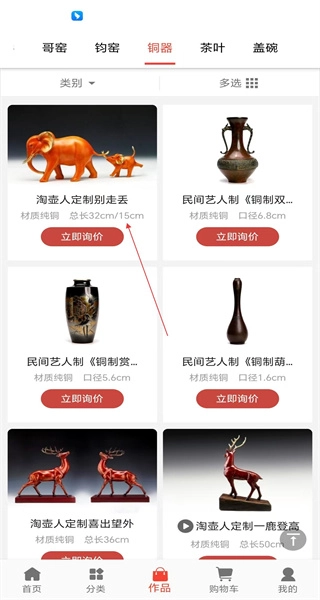 打开软件后,先进入作品分类页面,能看到紫砂等各类分类选项,接着点击铜器分类,即可进入铜器作品的展示页面。