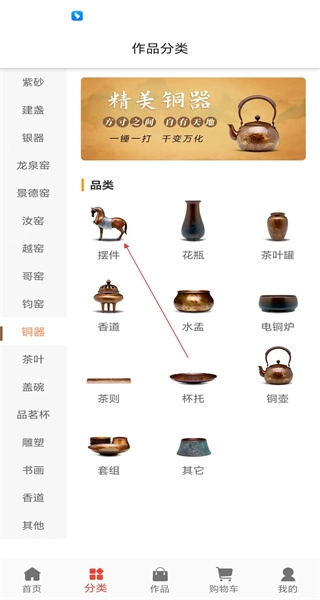 进入铜器页面后,在页面中找到摆件等品类选项,点击“摆件”这一选项,即可进入铜器摆件的作品列表页面。
