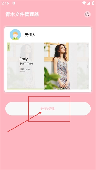 在【青木文件管理器】的界面里,当看到与【Early-summer】有关的展示内容以及账号【无情人】后,点击【开始使用】按钮就能进入到接下来的环节。