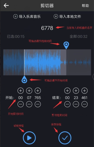 导入音乐后,你可以拖动时间轴来调整音乐的起始和结束时间,也能通过按钮进行调节,调节好后点击保存就行。要是你想去除歌曲中间的某段内容,只能先把音乐的开头和结尾部分分别截取出来,再将这两部分合成在一起。
