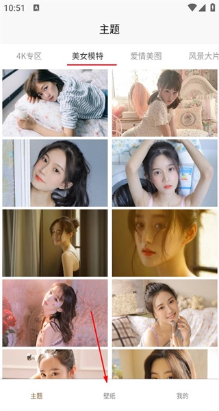 1、打开软件后,进入主题页面,浏览美女模特类壁纸,点击下方壁纸选项,切换至壁纸分类页面。