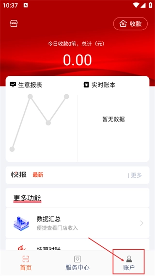 2、在软件首页,可查看收款数据及生意报表等信息,点击底部【账户】选项,进入对应的账户相关操作页面。