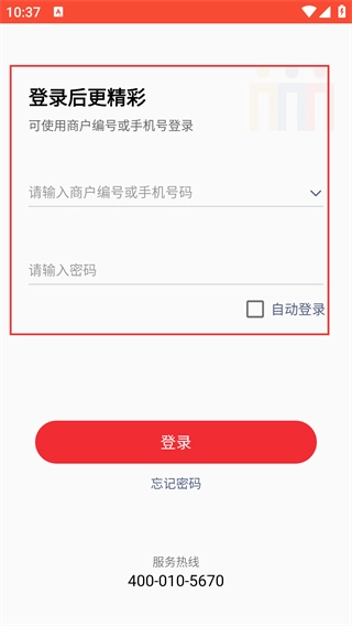 4、在登录页面,填写【请输入商户编号或手机号码】-【请输入密码】,可勾选【自动登录】后点击登录使用功能。