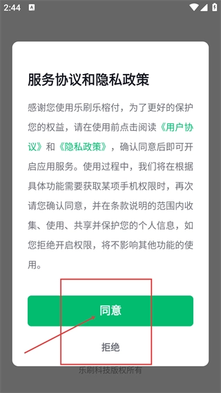 在乐刷乐榕付弹出的服务协议与隐私政策窗口里,仔细阅读《用户协议》和《隐私政策》这两份文件后,点击【同意】按钮,就能进入应用的后续流程了。