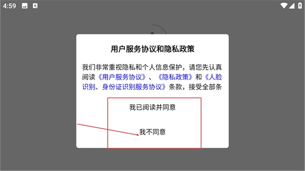 1、在使用本软件之前,请务必仔细阅读《用户服务协议》《隐私政策》以及《人脸识别-身份识别服务协议》,并点击“我已阅读并同意”按钮,方可继续进行后续操作。
