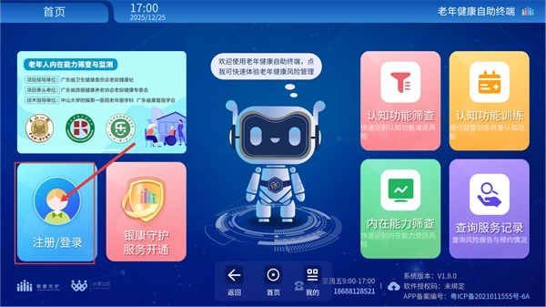 进入【老年健康自助终端-首页】后,找到【注册/登录】按钮完成账号操作,这是使用后续服务的必要前提。