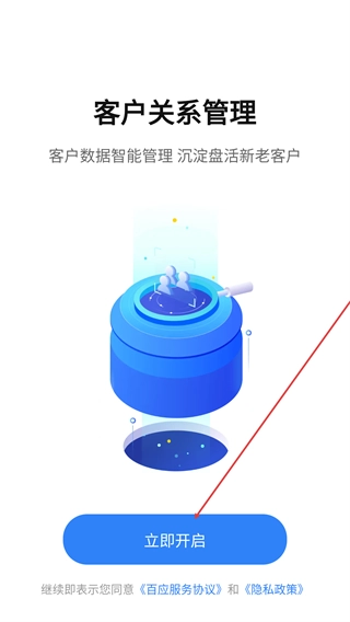 1、在【客户关系管理】页面,点击【立即开启】按钮,即可进入百应CRM的账号操作界面,开启客户管理功能。