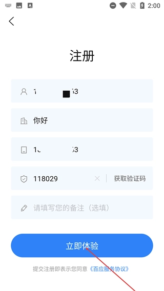 3、在注册界面填写所需信息(如账号、企业名等)并获取验证码后,点击【立即体验】完成注册并进入系统。