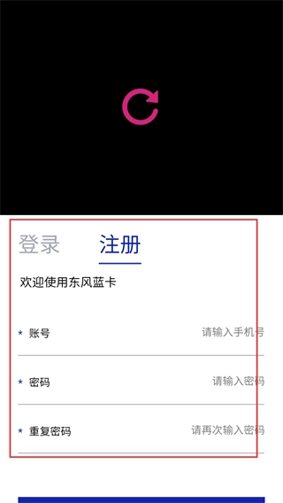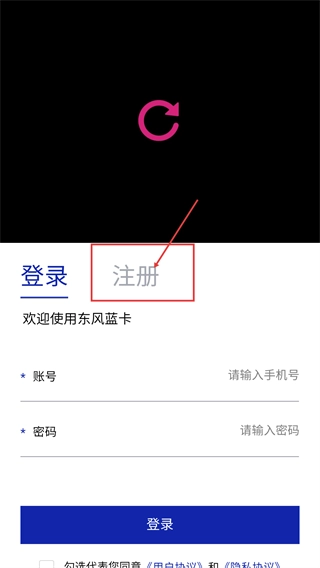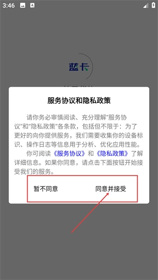 1、启动东风蓝卡后,弹出《服务协议和隐私政策》弹窗,阅读后点击【同意并接受】按钮,进入登录界面。