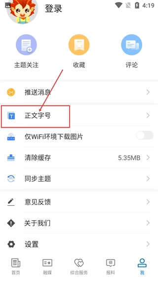 3、在个人页面中,找到【正文字号】选项并点击,该选项可用于调整软件内正文内容的显示字号。