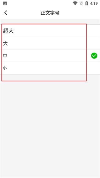 4、进入【正文字号】页面后,可在【超大-大-中-小】选项里选适配字号,当前页面默认选中的是【中】字号。