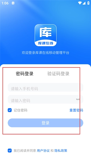 1、处理用户协议与隐私政策:在弹出的“用户协议和隐私政策”窗口中,点击“同意”按钮,即可进入库课在线的登录操作界面。