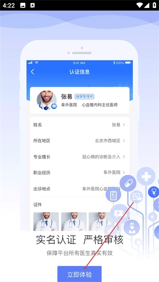 2、在认证信息引导页,了解平台医生实名认证规则后,点击【立即体验】按钮,进入应用核心功能环节。