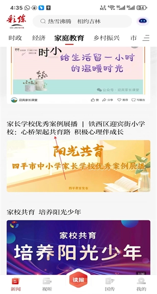 1、打开软件首页,看到时政经济等分类,点击家庭教育选项切换到对应内容页面。