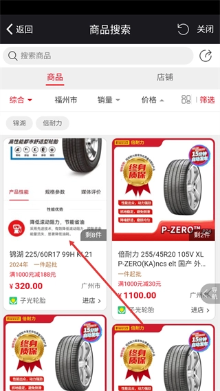 3、在轮胎商品列表中,选择目标轮胎(如锦湖225/60R17),点击该商品即可进入详情页面。