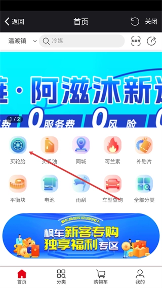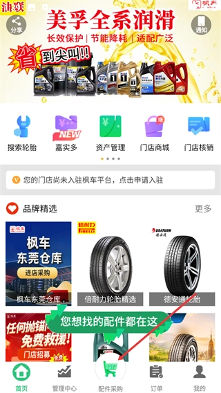 2、在配件采购界面,点击【买轮胎】功能入口,即可进入轮胎类商品的搜索与选择页面。