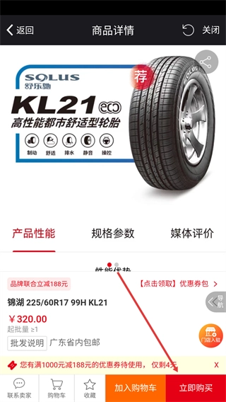 4、进入商品详情页后,可查看轮胎的性能、参数等信息,还能通过【立即购买】按钮完成采购操作。