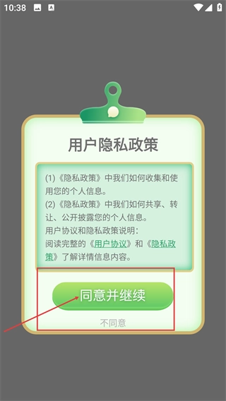 进入软件后,需先查阅《用户隐私政策》和《用户协议》的具体内容,在确认无误后点击“同意并继续”按钮,方可进入软件主界面进行后续操作。