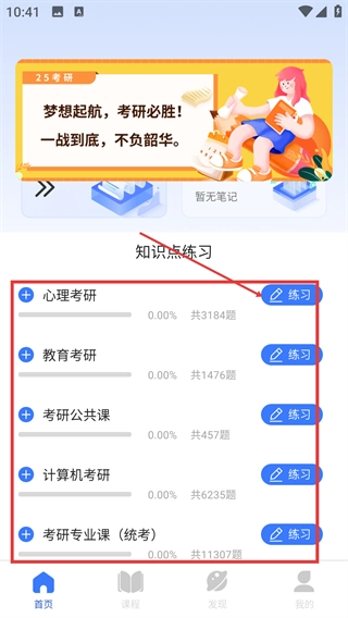 2、在【知识点练习】板块中,找到对应的考研类目(例如【心理考研】),点击其右侧的【练习】按钮,就能进入对应科目的刷题环节。