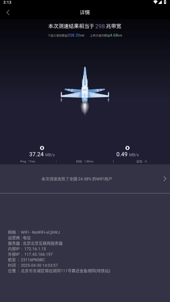 2、点击详情可查看本次测速结果