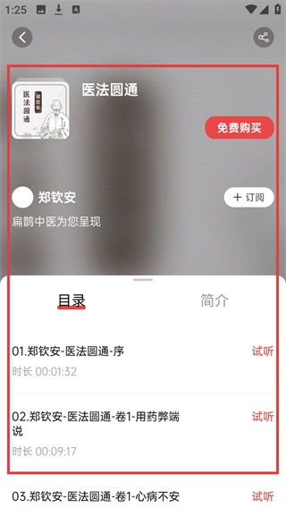 4、进入【医法圆通】课程详情页面,能够查看课程的目录以及试听内容,点击【免费购买】按钮就可以获得该课程的学习权限。