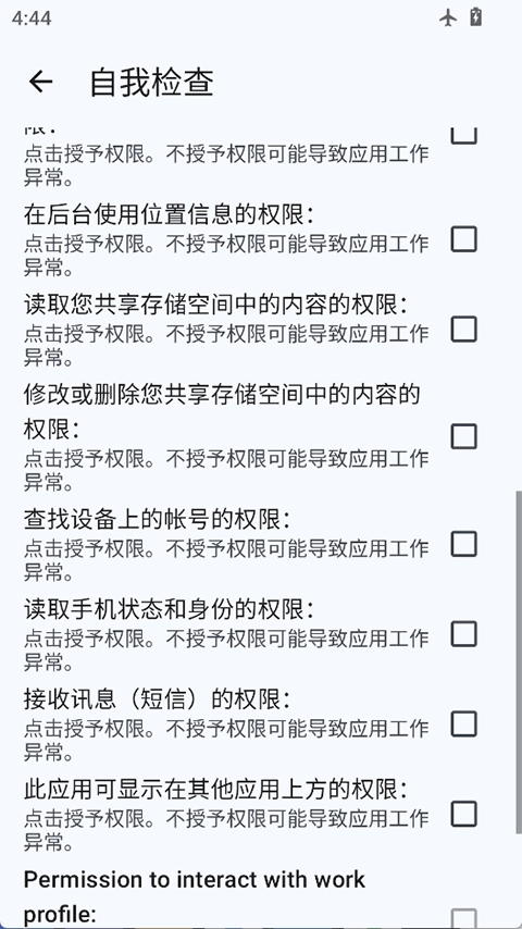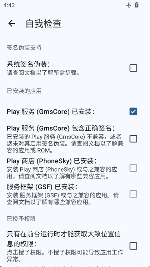重启后首次进入microG设置界面,点击Self-Check时会弹出授权提示,需要授予存储、电话、通讯录、定位等权限,直接完成授权操作即可。