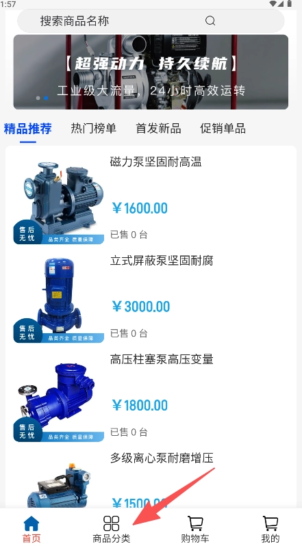 2、在分类页面的左侧选择分类后,右侧会展示出对应的商品类别,例如“低噪音泵”这类。