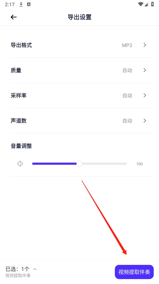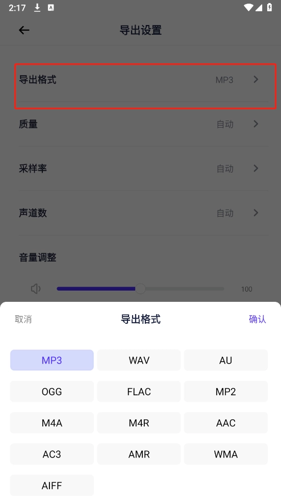 接下来要设置导出的音频格式,系统默认选用mp3格式,也能够手动调整为其他格式并设置相应的音频参数。