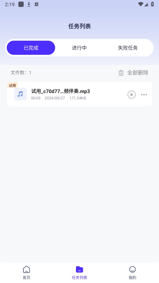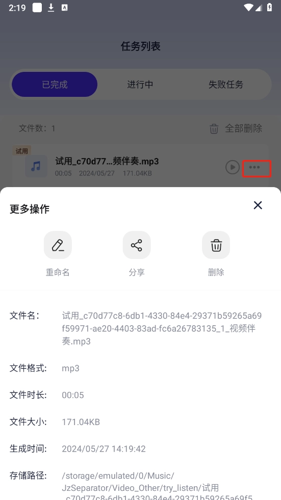 你可以点击音频文件的播放按钮试听内容,也能通过点击三个点的图标来完成重命名、分享、删除等操作。