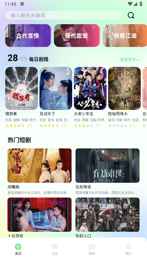 进入首页后,能看到详尽的短剧分类板块,涵盖古代言情、现代甜宠、侠客江湖等多种类型。