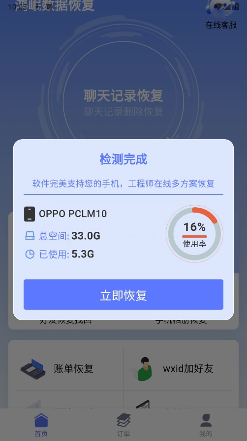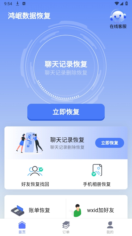 进入首页后,能看到不少数据恢复相关的板块,像相册恢复、好友恢复以及账单恢复这些功能都包含在内。